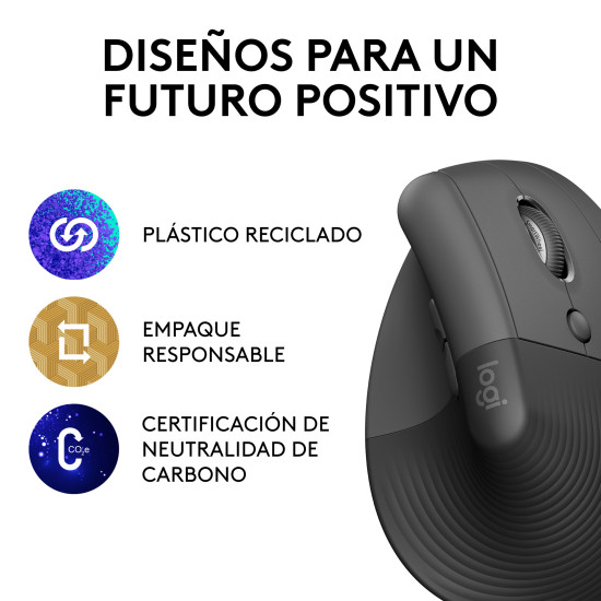 Disfruta de hasta dos años de uso sin preocuparte por los cables o por cambiar pilas constantemente. El Logitech Lift viene listo para usar con una batería AA incluida que te brindará energía por un largo periodo. Además, al elegir este producto, apoyas la iniciativa de Logitech de utilizar plásticos reciclados post-consumo y empaques 100% de papel certificado FSC, contribuyendo a un planeta más verde.